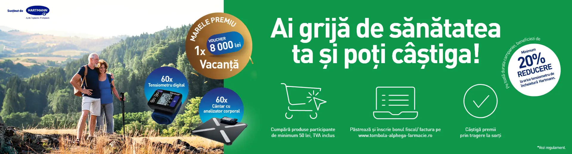 *Campania se desfășoară în perioada 18.08.2025 – 30.09.2025, în limita stocului disponibil, în farmaciile Alphega semnalizate.